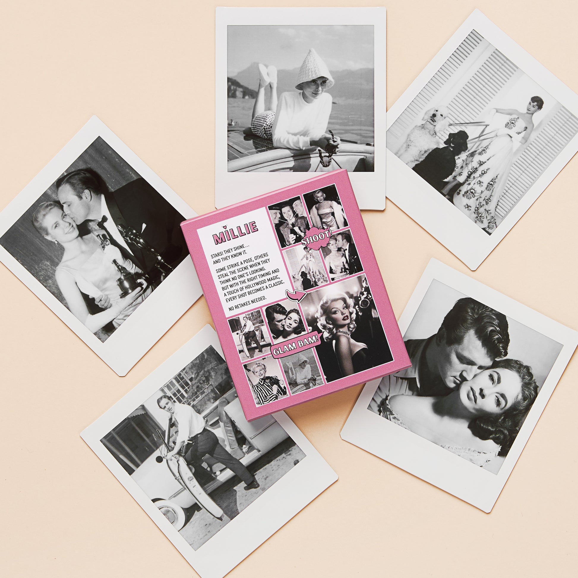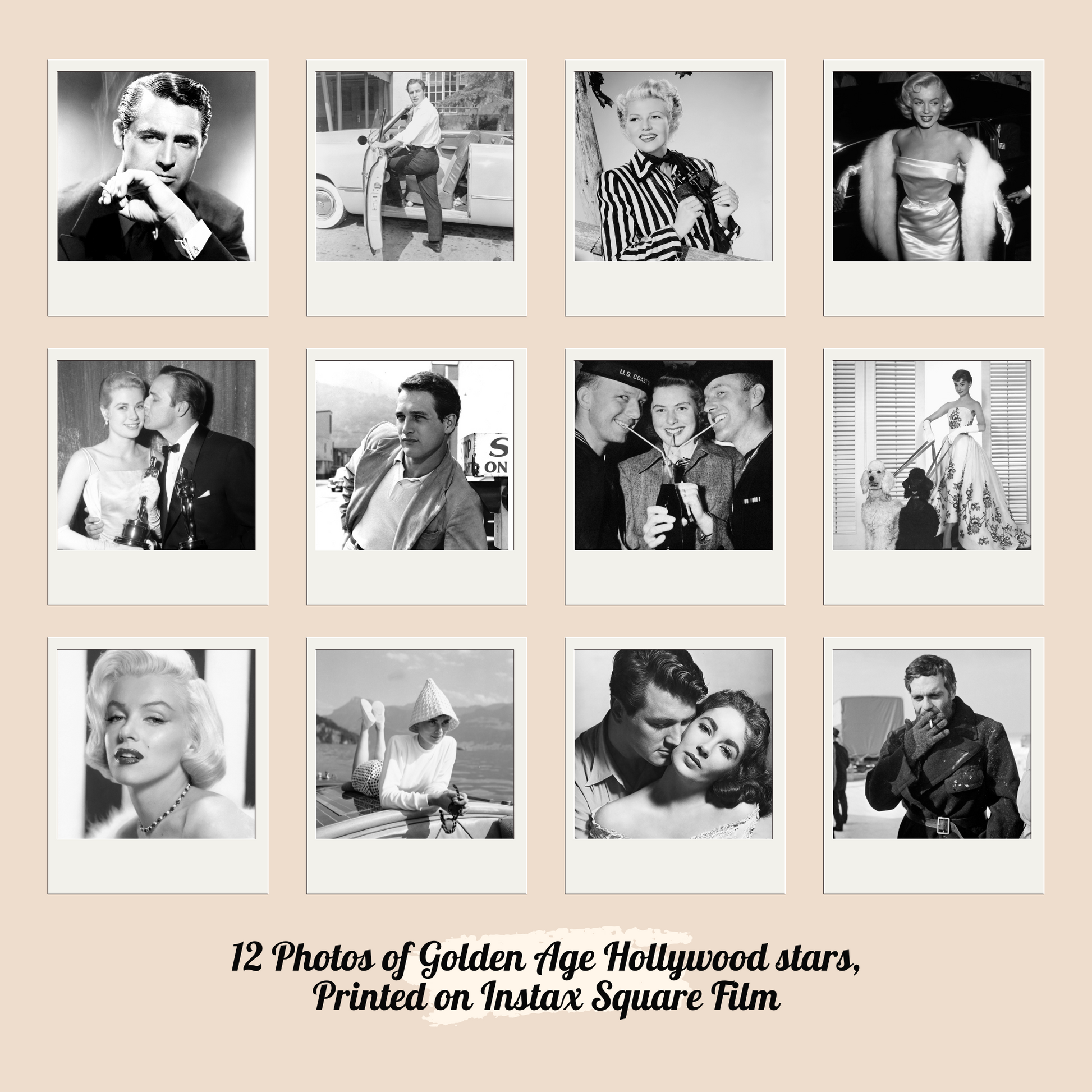 This collection includes 12 archival photographs of Hollywood stars, taken between 1940 and 1965, now printed on real Instax Square film.